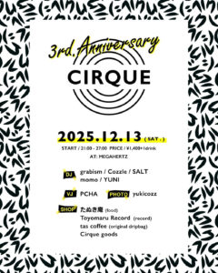 12.13 Cirque -3rd Anniversary SP- カレンダー カレンダーに追加 Timely カレンダーに追加 Google に追加 Outlook に追加 Apple カレンダーに追加 他のカレンダーに追加 XML ファイルとしてエクスポート 日時: @ 2025-12-13T01:25:00+09:00 2025-12-13T01:40:00+09:00 event 21:00-27:00 /1400(+1d) ●DJs: grabism / Cozzle / SALT / momo / YUNI ●VJ: PCHA ●PHOTO: yukicozz ●SHOP: たぬき庵(food) Toyomaru Record(レコード) tas coffee(original dripbag) Cirque goods