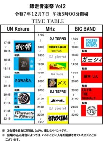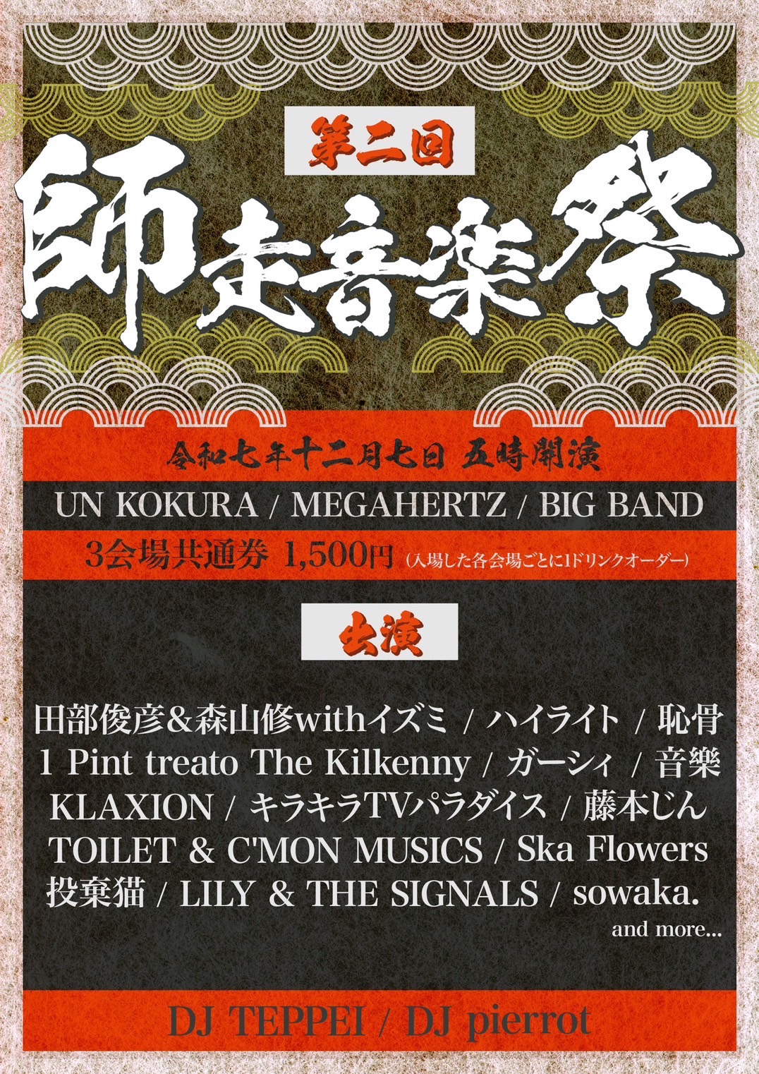 12.7 師走音楽祭2025 カレンダー カレンダーに追加 Timely カレンダーに追加 Google に追加 Outlook に追加 Apple カレンダーに追加 他のカレンダーに追加 XML ファイルとしてエクスポート 日時: @ 2025-12-07T17:00:00+09:00 2025-12-07T17:15:00+09:00 event 音楽ビル・ダイヤ会館ならではの、ビル内3店舗ライブサーキット!!!師走の風物詩になりつつあるこのイベント、どなたでも入場可ですので、是非ローカルバンド達を体験してみてください!!!